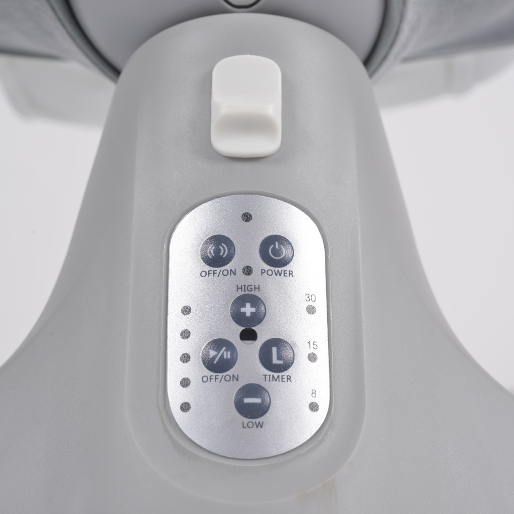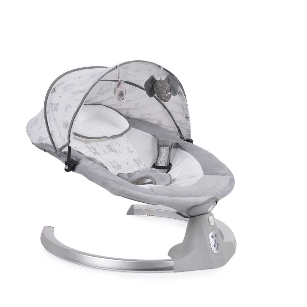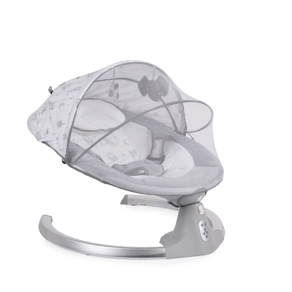 Има 5 скорости на люлеене, таймер с 3 времена, 12 прекрасни мелодии, 3-точков колан, сенник с мрежа против насекоми с 2 меки играчки и функция “шезлонг“ при застопоряване на механизма. Тапицерията може лесно да бъде свалена.