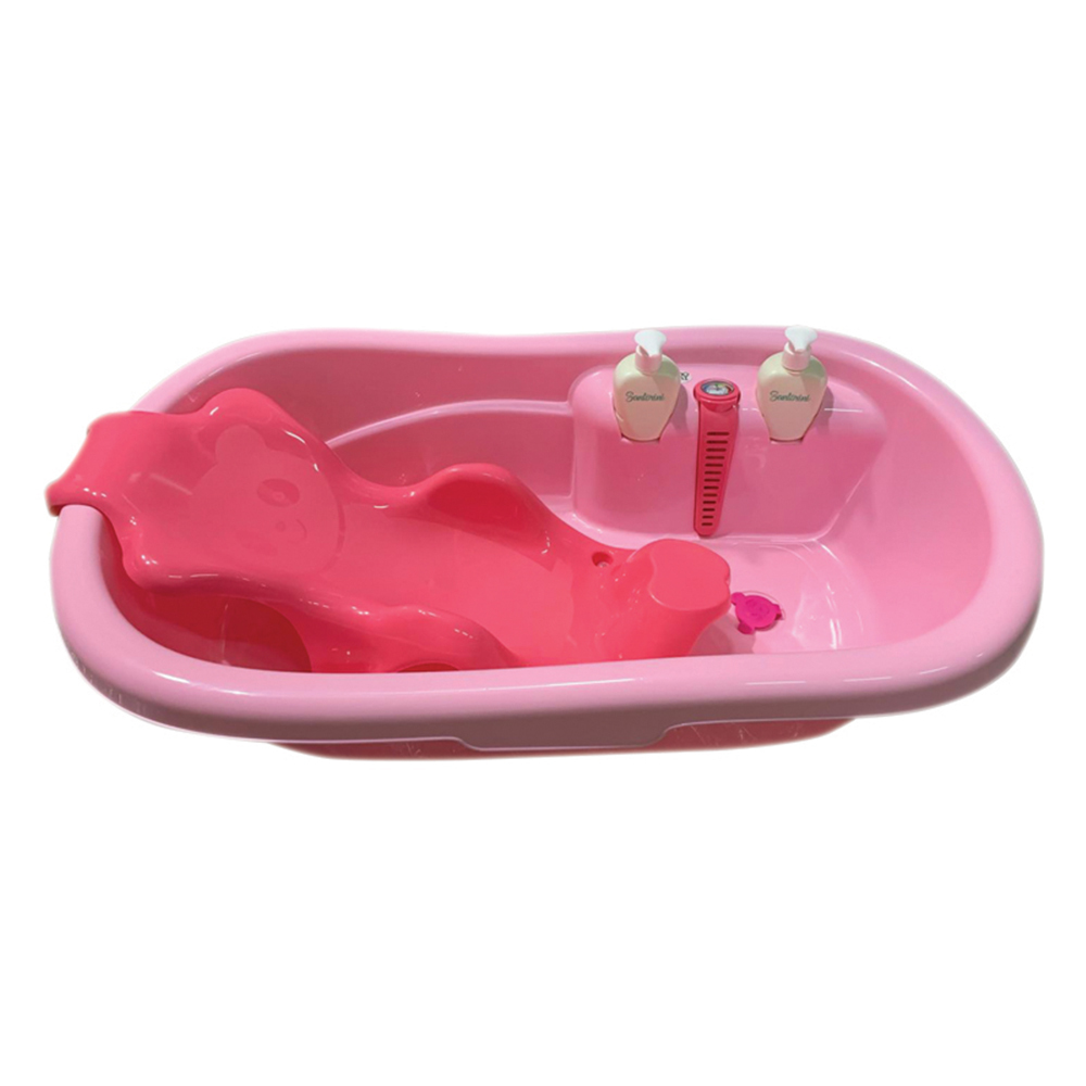 Анатомична вана Santorini розов оборудвана с термометър, бутилки за шампоан и душ гел.