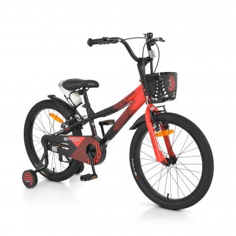 Детския велосипед е оборудван с помощни колела, звънец, пластмасови калници, предпазител за веригата, преден кош и шише за вода.
