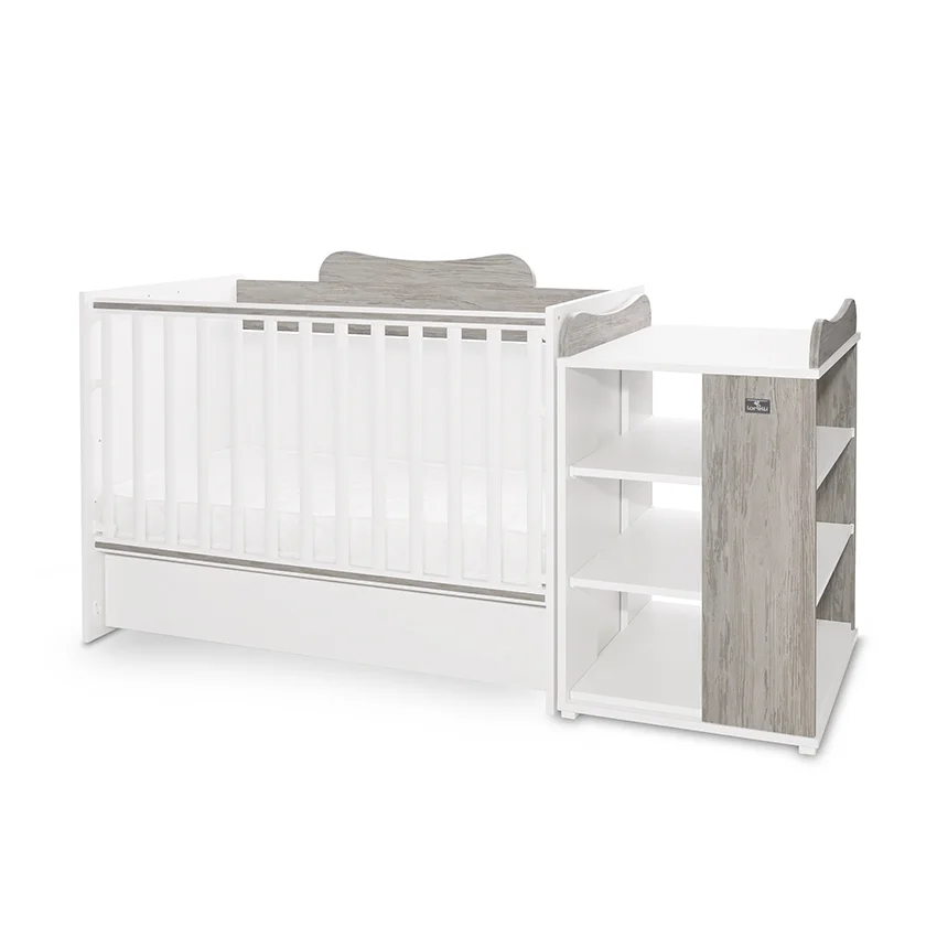 Бебешко легло (124х71х99 см) за матрак 60х120 см, допълнено от самостоятелен шкаф (71х55х90 см).