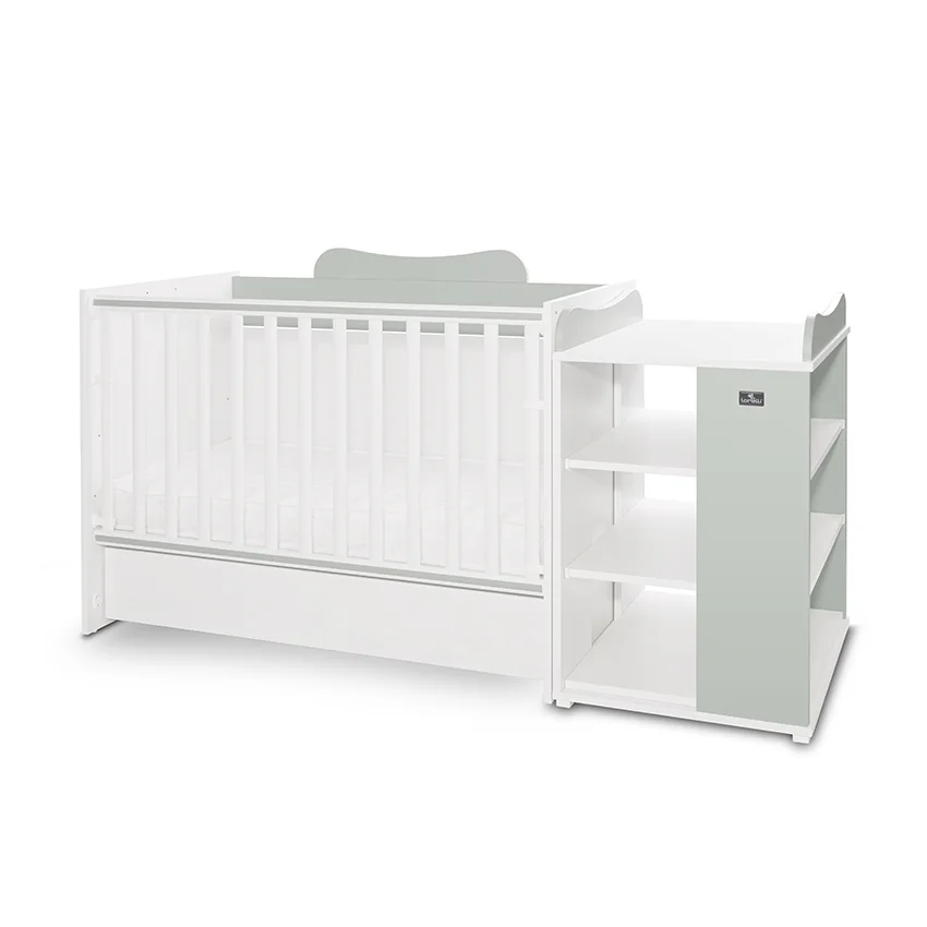 Внесете свежест и практичност в детската стая с LORELLI MULTI Milky Green. Този модел е комплексно решение за обзавеждане, което включва голямо чекмедже и предлага впечатляващите 5 варианта на трансформация. Съчетанието от нежен пастелен цвят и здрава конструкция от 18 мм ламинирано ПДЧ го прави перфектен избор за родители.